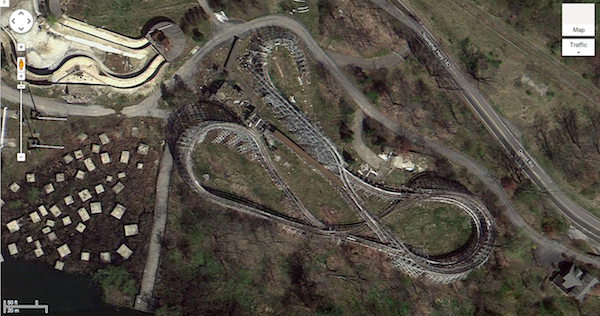 Raging Wolf Bobs is the woodie to the right. The blocks on the left were the footers for the B&M floorless coaster Dominator and the edge of the lake is just below.