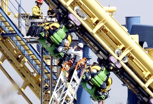 Rescue workers attempt to fasten harnesses on riders and secure the cars of the stuck Invertigo ride before taking them off to safety at California’s Great America Amusement Park in Santa Clara, Calif. on Monday, Aug. 10, 2009. (AP Photo/San Jose Mercury News, Karen T. Borchers/Mercury News) ** MAGS OUT; NO SALES; ALL INTERNET OUT – NO WEB USAGE; MANDATORY CREDIT ** Original Filename: Rollercoaster_Stuck_CAJOS101.jpg